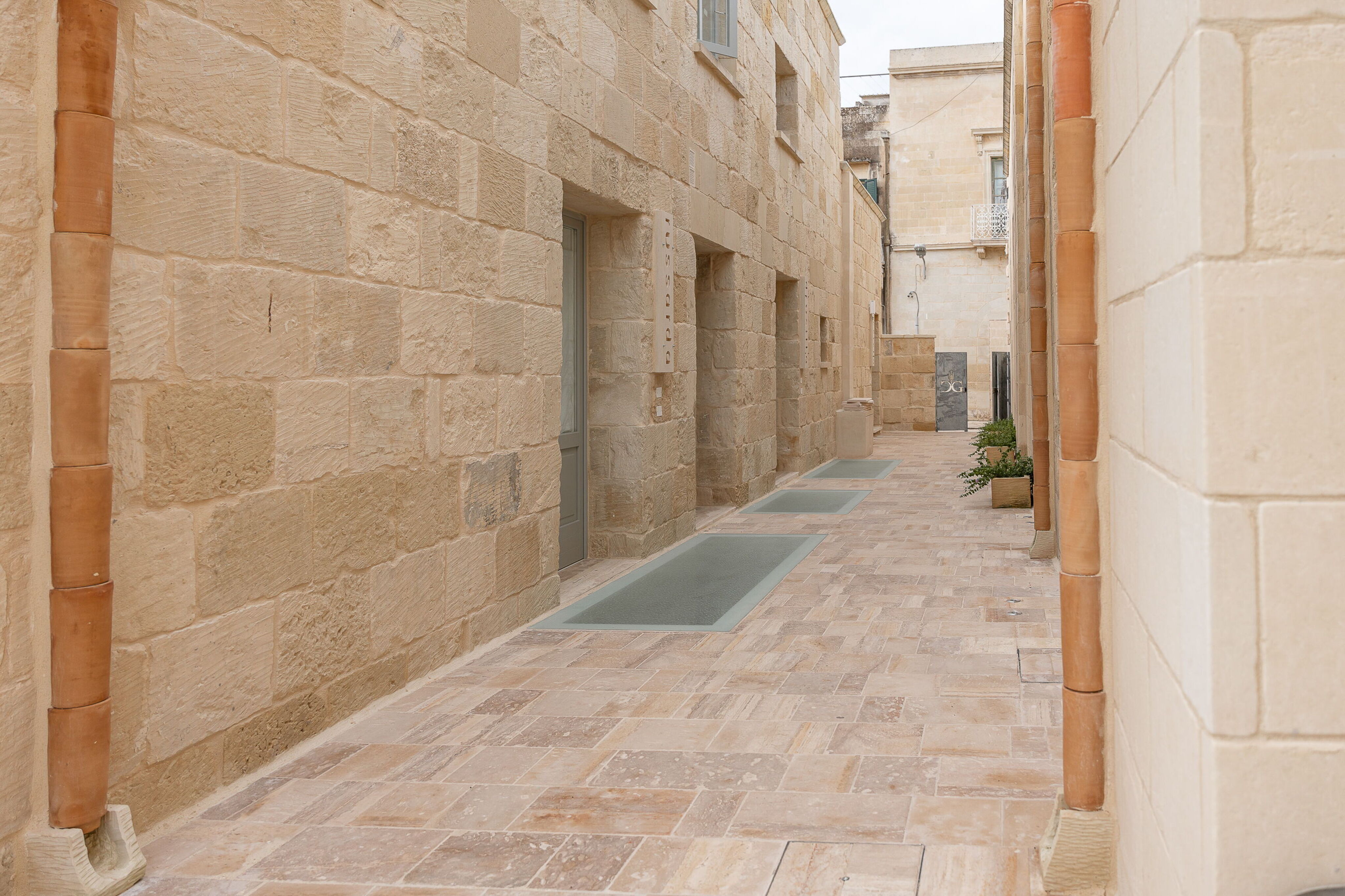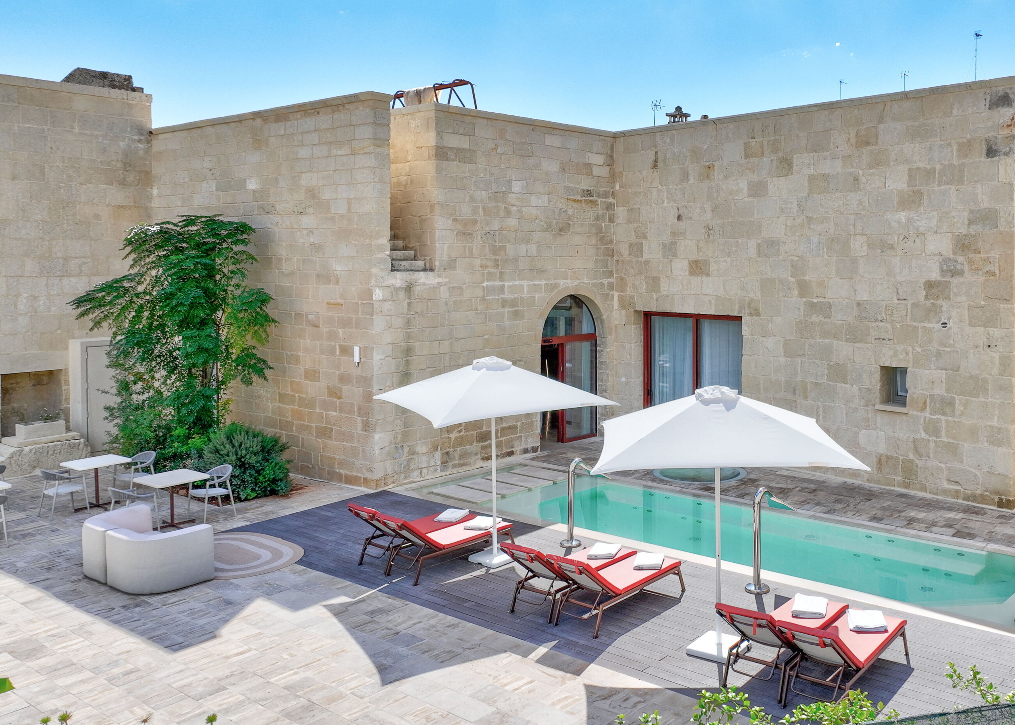 Stone, the undisputed protagonist of the building, dialogues harmoniously with innovative materials: glass, iron, and resin intertwine to create bright spaces, fresh during the day and soft and romantic in the evening. Corte dei Granai, which stands out in the panorama of Salento excellence, offers an impeccable welcome thanks to staff always ready to make every stay authentic, sophisticated, and relaxing – with, among other comforts, an outdoor pool designed for moments of pure well-being.